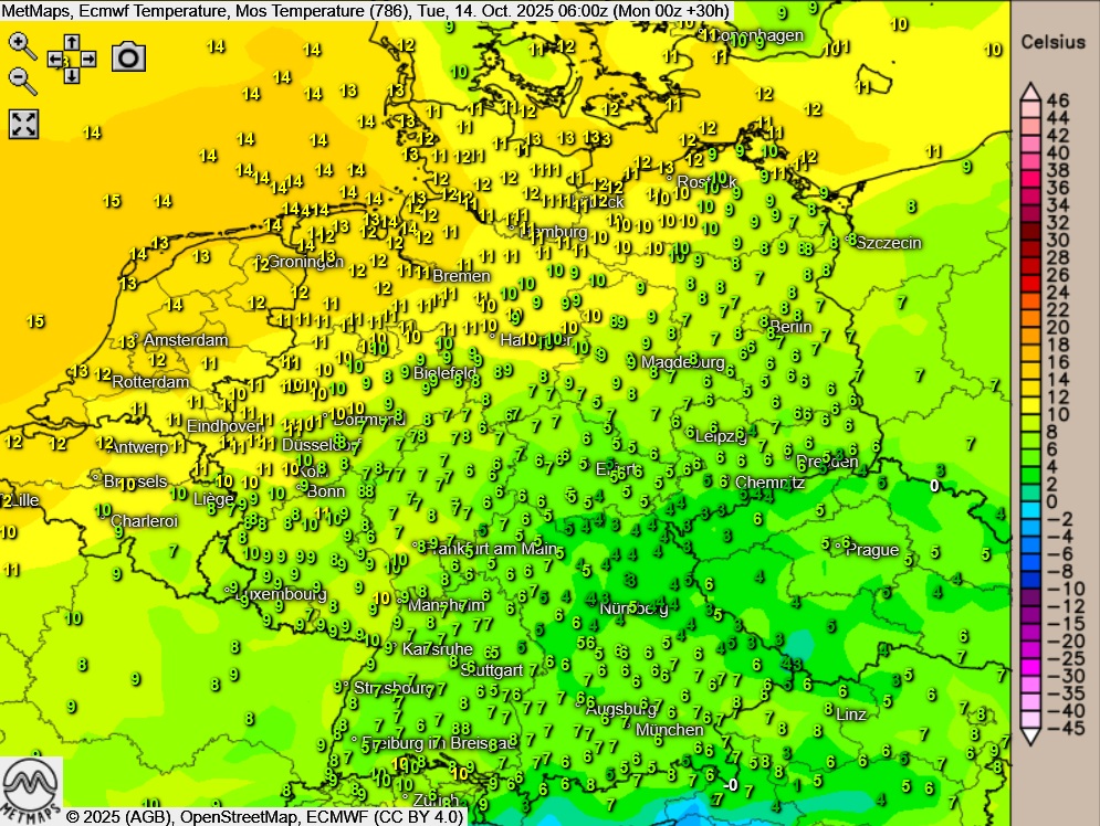 Die Temperaturen am Dienstagmorgen (06:00 Uhr) sowie die 24-Stunden-Regenmengen für Dienstag nach Ecmwf: