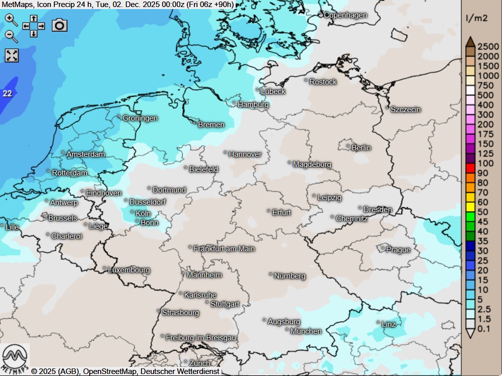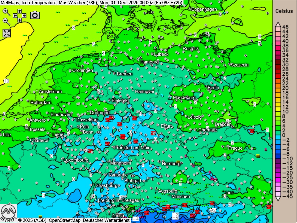 Die Temperatur- / Wetterkarte für Montagfrüh sowie die 24-Stunden-Regenmengen für Montag nach ICON: