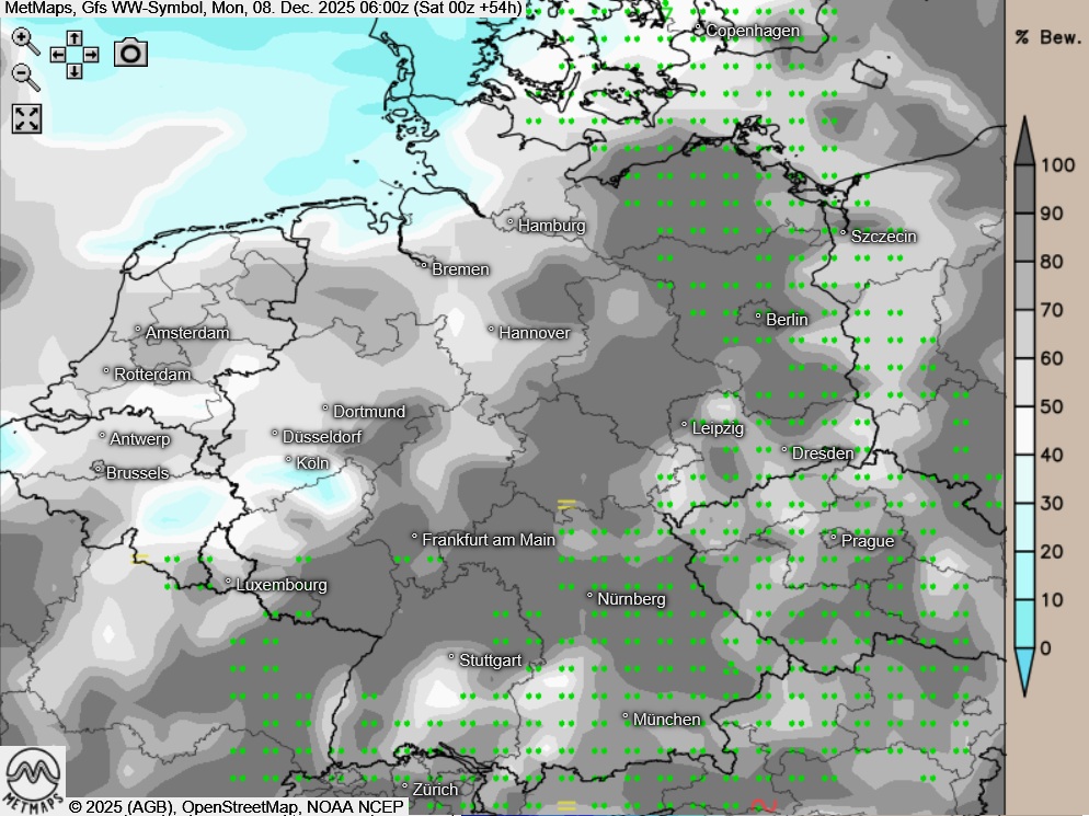 Am Montag zeigt sich der Himmel über weiten Landesteilen zunächst stark bewölkt, dabei greift im Tagesverlauf eine Warmfront mit Regen auch auf die Osthälfte über. Im Anschluss gibt es bei gebietsweisen Auflockerungen auch längere trockene Abschnitte.