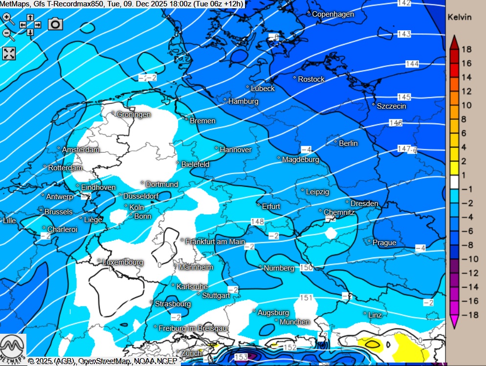 Die Temperatur- / Wetterkarte für Dienstagnachmittag (16:00 Uhr) sowie die Temperaturabweichung vom Rekordwert am Dienstagabend (18:00 Uhr) nach GFS: