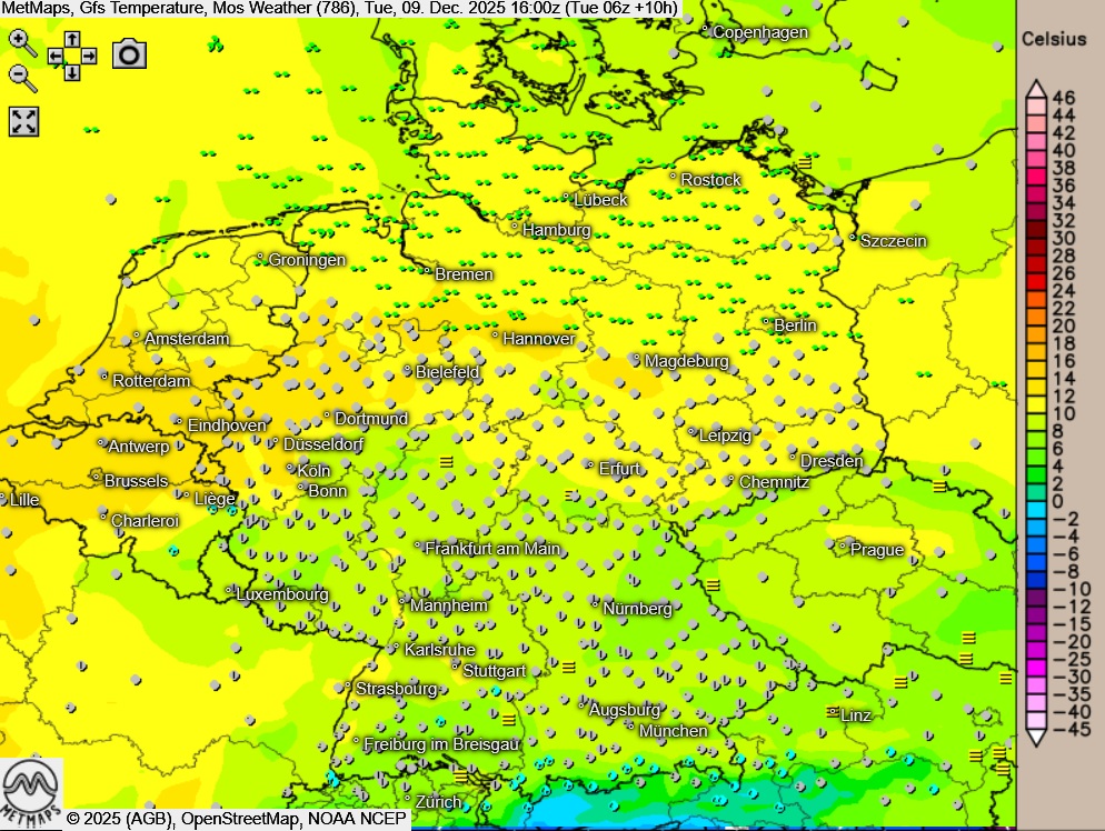 Die Temperaturen erreichen Höchstwerte um 9 Grad im nördlichen Schleswig-Holstein und um 16 Grad im Breisgau.