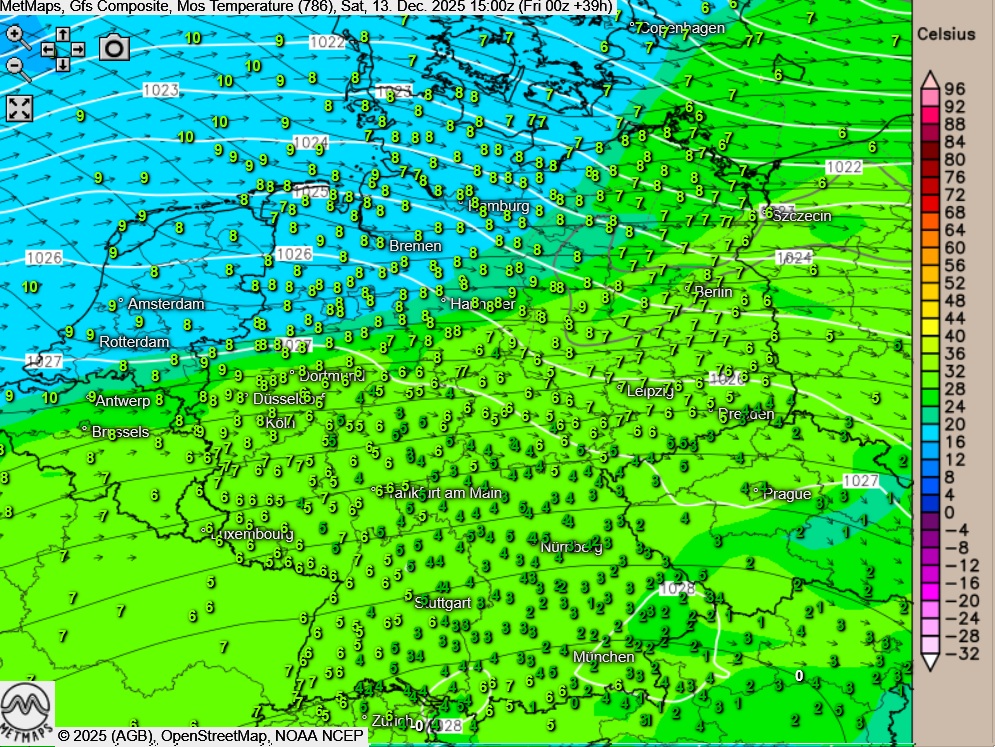Die Temperatur- und Wetterkarte für Donnerstagnachmittag (15:00 Uhr) nach GFS: