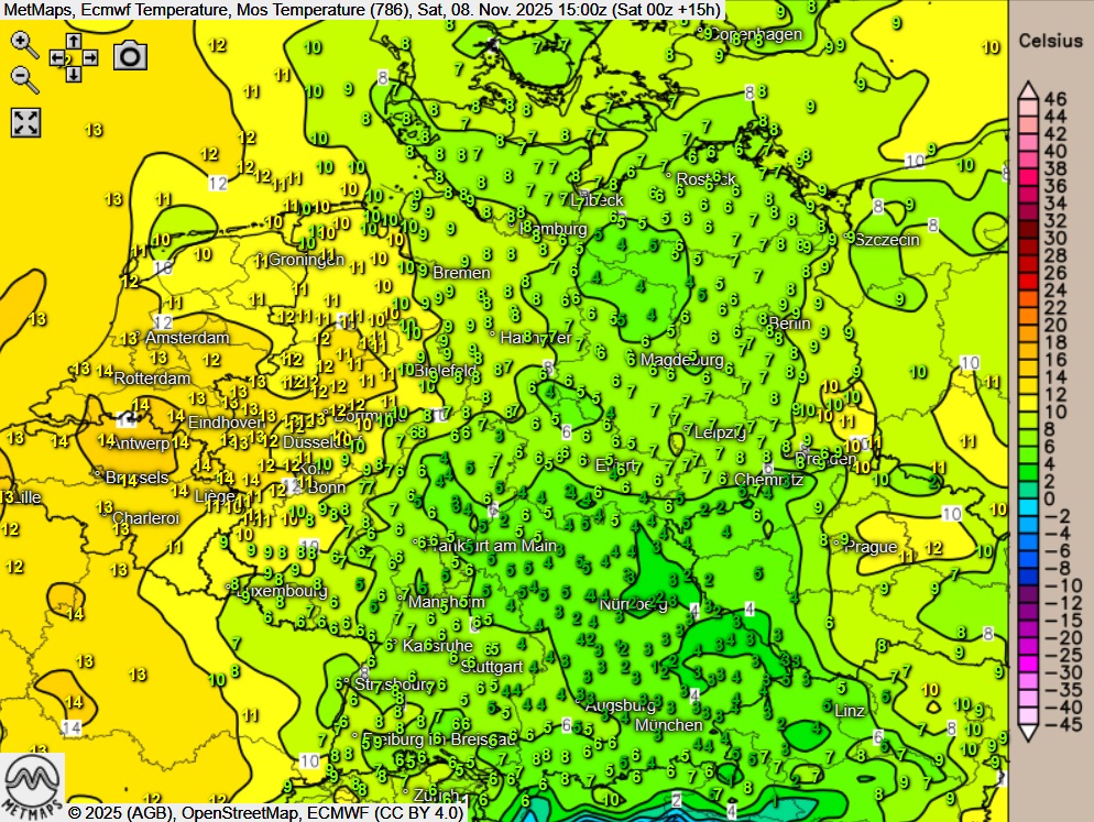 Die Temperatur- und Wetterkarte für Samstagnachmittag (15:00 Uhr) nach ECMWF: