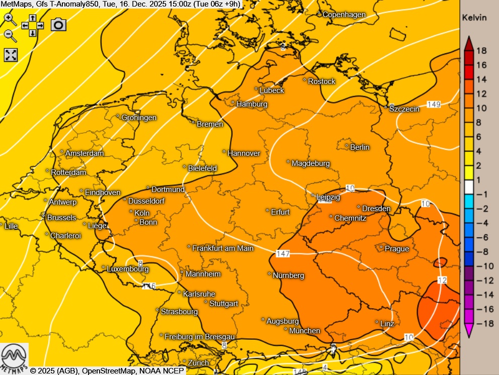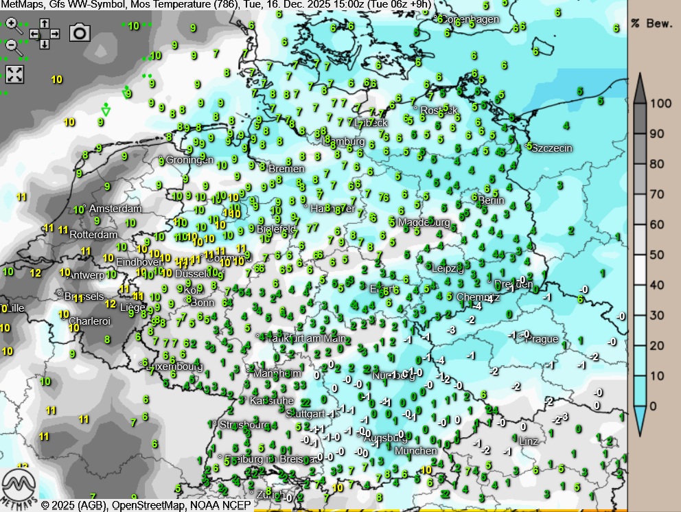 Die Bewölkungs- / Temperaturkarte sowie die Temperaturanomalie in 1.500 m Höhe am Dienstagnachmittag (15:00 Uhr) nach GFS: