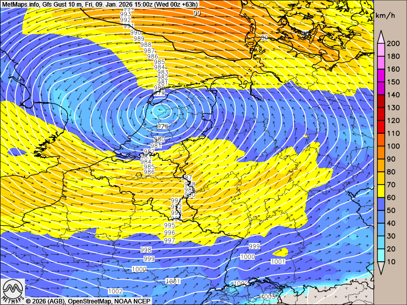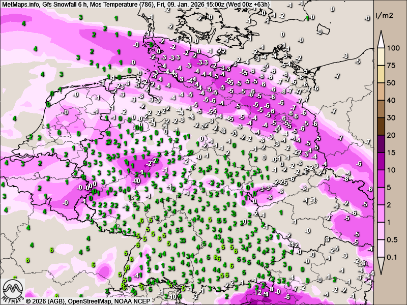 Hier der Sechs-Stunden-Schneefall bis Freitagnachmittag und die Böenkarten für Freitagfrüh und Freitagnachmittag (09:00 Uhr / 15:00 Uhr) nach GFS: