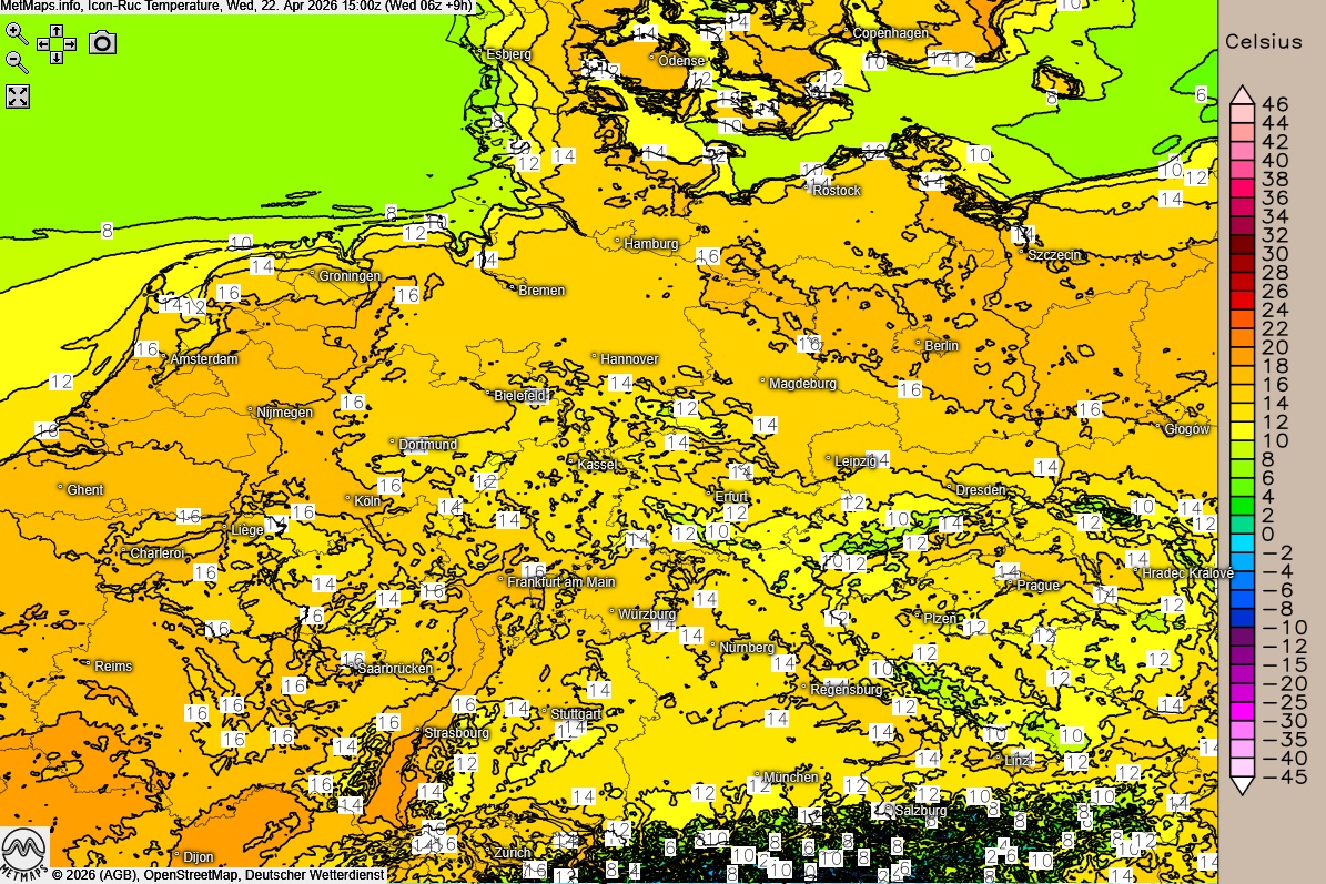 Die Temperaturkarte für 15:00 Uhr nach ICON-RUC: