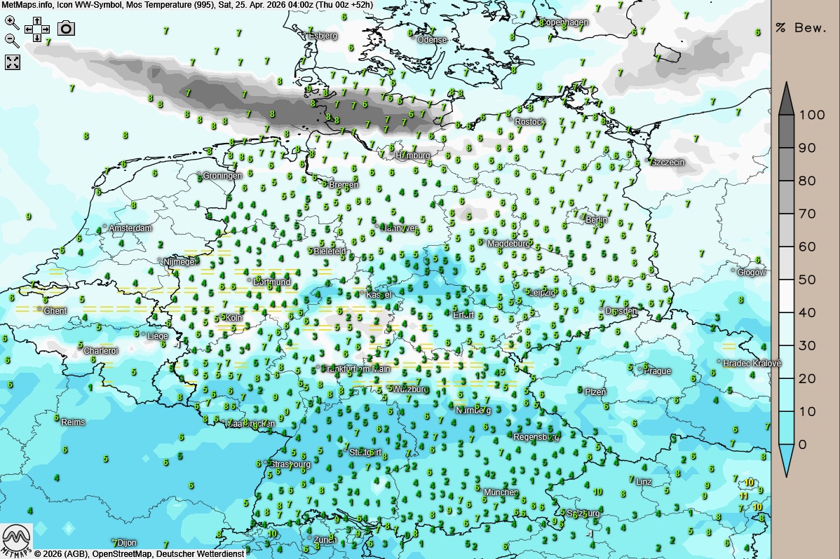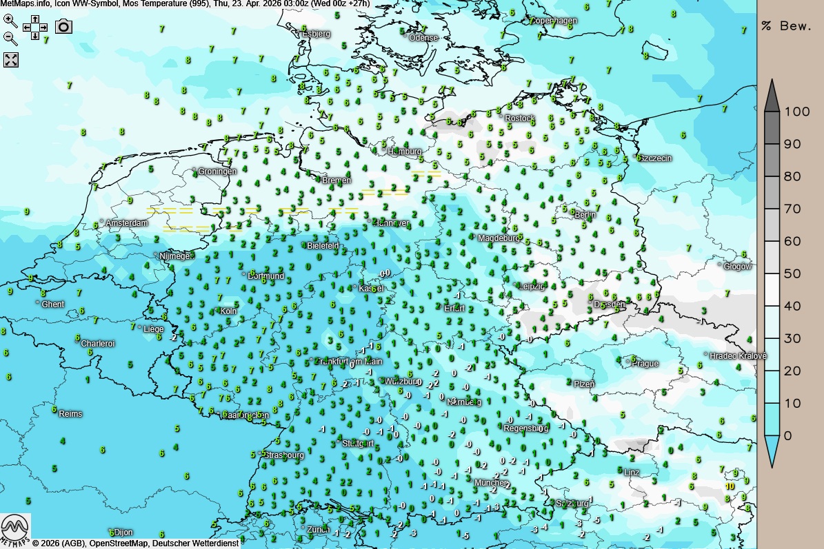 Die Wetter- und Temperaturkarte für Donnerstagfrüh (03:00 Uhr) nach ICON: