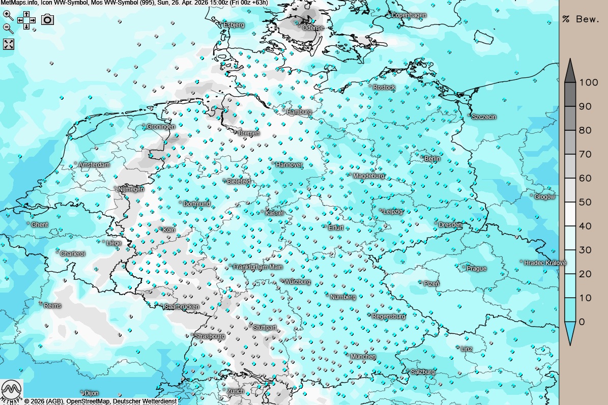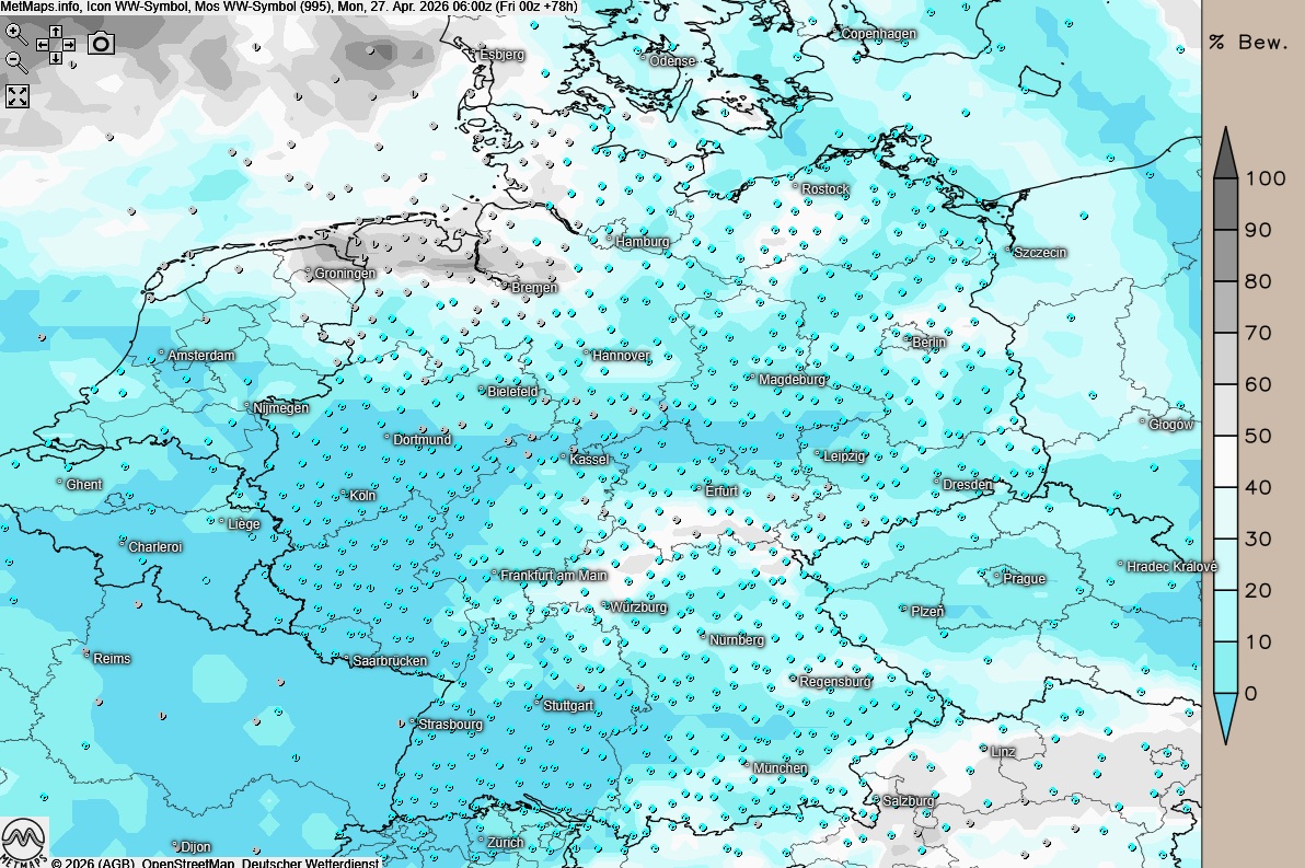 In der Nacht zum Montag klart es auf, was die Temperaturen auf +5 bis -2 Grad sinken lässt – im Nordosten muss man sich lokal sogar auf mäßigen Bodenfrost einstellen.