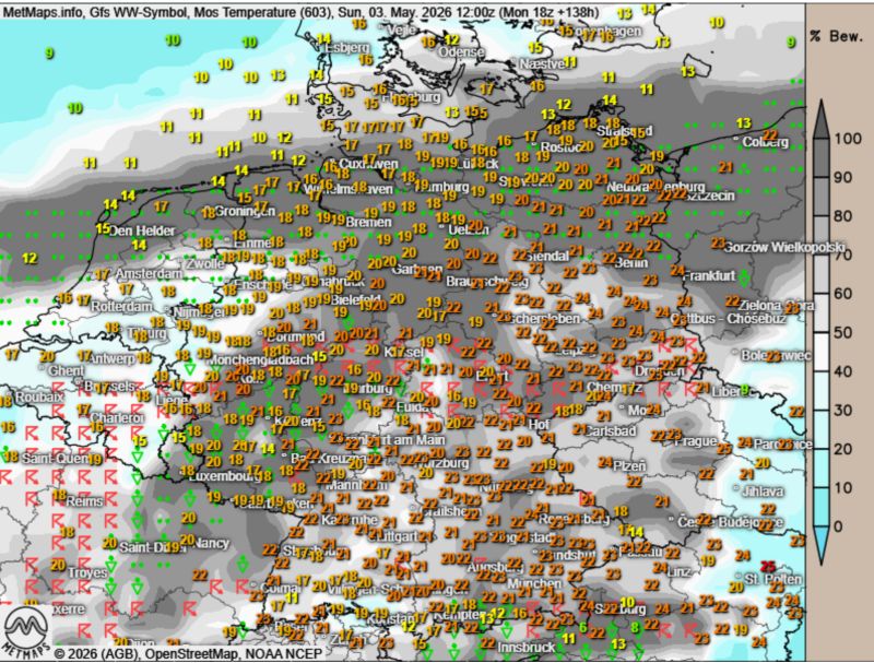 Das Hochdruckgebiet rückt näher an Deutschland heran und legt sein Zentrum über den Kontinent. Die kühle Nordwestströmung flaut ab, wodurch sich die Luftdruckgegensätze abschwächen und die Wetterlage landesweit stabilisiert.
