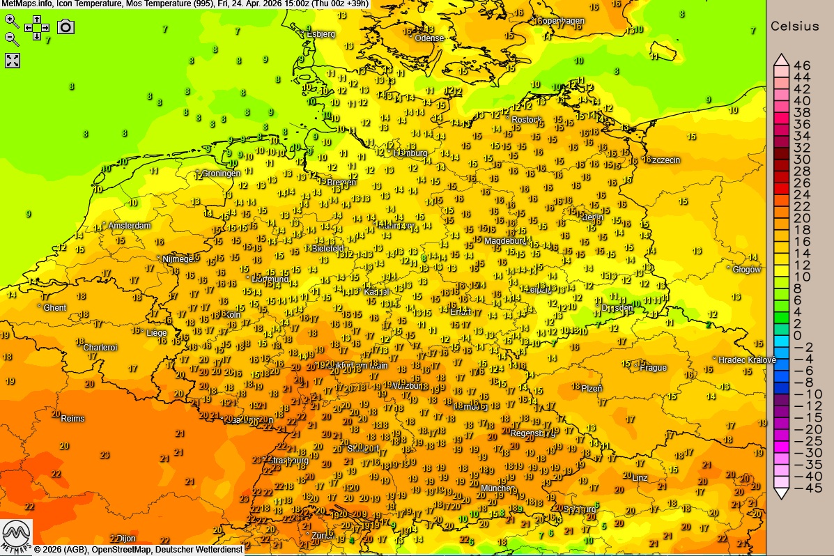 Die Temperaturen erreichen im Norden und Osten je nach Sonnenscheindauer angenehme 12 bis 16 Grad. Deutlich milder zeigt sich der Südwesten: Entlang des Oberrheins sowie im Neckartal sind Höchstwerte um 20 Grad möglich.