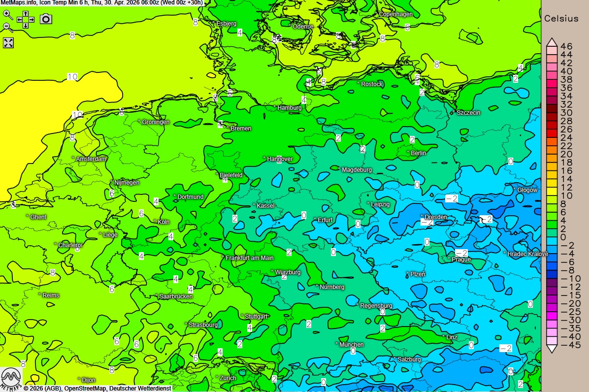Die Sechs-Stunden-Tiefswerte bis Donnerstag (06:00 Uhr) nach ICON: