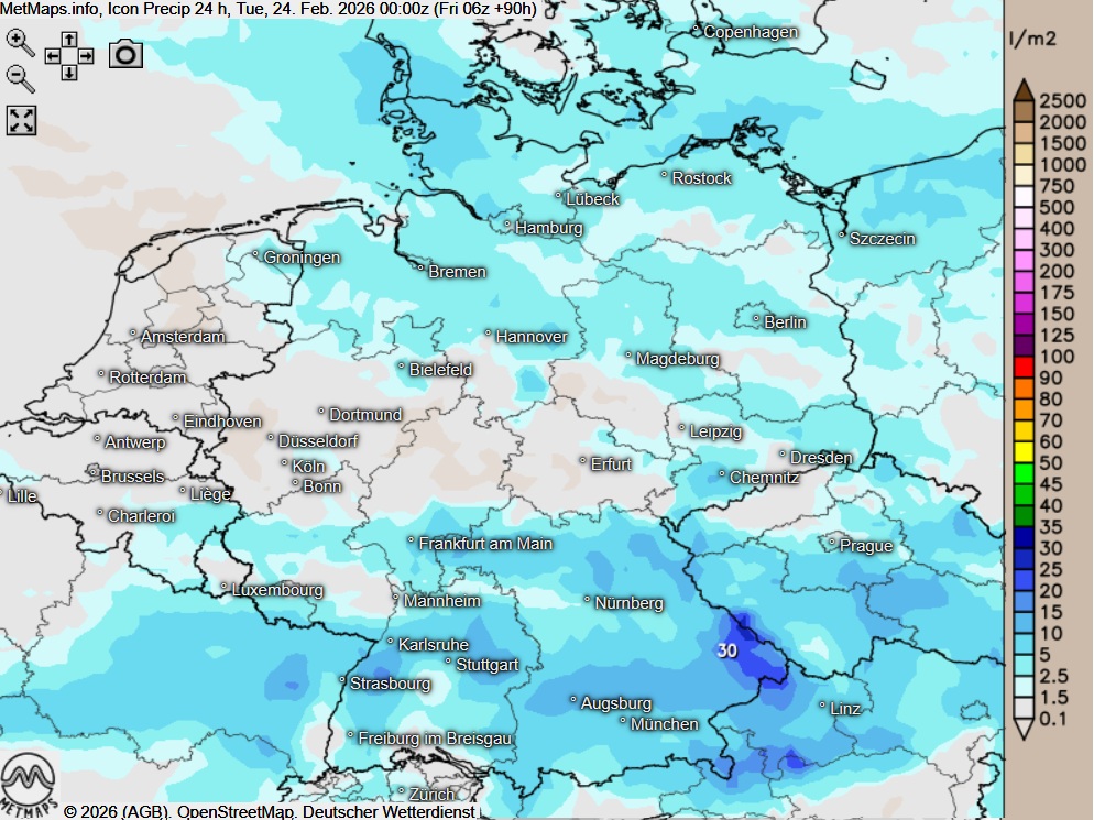 Die Wetter- / Temperaturkarte für Montagmorgen (06:00 Uhr) sowie die 24-Stunden-Regenmengen am Montag nach ICON:
