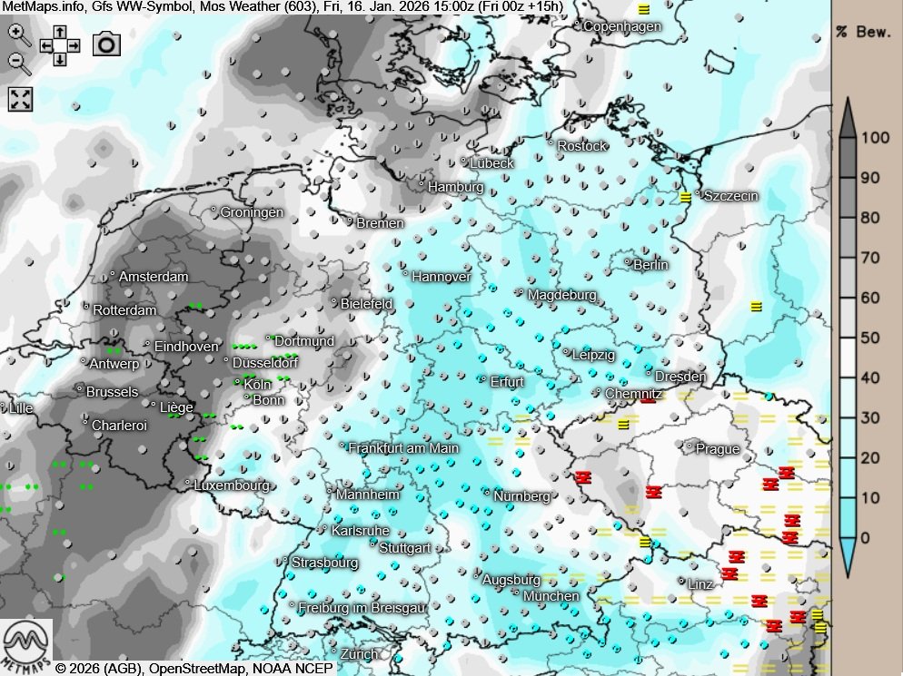 Dann gelangt mit einer östlichen Strömung zögerlich sehr kalte Luft nach Deutschland. Zwar zeigen die Wettermodelle noch Unterschiede im Detail, die Mehrzahl rechnet jedoch ab der Mitte kommender Woche mit teils strengen Nachtfrösten, die sich bis zum nächsten Wochenende ausweiten können. Neuschnee ist dabei aber nicht überall zu erwarten.