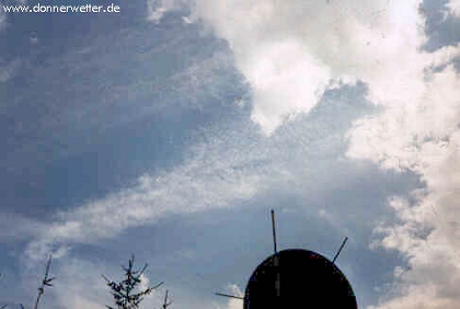 Eine Cumulus humlilis, Cirrocumuli und ein Kondensstreifen sind auf diesem Bild zu sehen. Ich denke, es ist eine wechselhafte Wetterlage. OK, die Cumuluswolke ist nicht gerade groß, aber die Cirrocumuli und der Kondensstreifen zeigen uns, dass in der oberen Troposphäre viel Feuchtigkeit ist. Cirrocumuli sind ein Zeichen für Instabilität in Höhen von 5-11 km. Es könnte sich also um eine Spätsommersituation handeln, mit einem Tiefdruckgebiet, das sich an die Troposphäre über dem Beobachter annähert und diese labilisiert. Während der Nacht könnte es ein Gewitter geben.