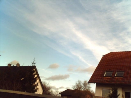 Zwei verschieden Wolkenarten sind auf diesem Bild zu sehen. Ein paar Cirruswolken ziehen in Richtung Süden und darunter zieht eine Cumuluswolke in Grautöne gehüllt vorbei. Normalerweise ist es nur mit den uns vorliegenden Informationen sehr schwer, eine Vorhersage über das Wetter zu treffen. Aber es sieht danach aus, dass man mit einem klaren Himmel in den nächsten Stunden rechnen kann. Wenn eine Cirrus- und tiefe Cumulusbewölkung dem schlechten Wetter folgt, befindet man sich meist hinter einer Wetterfront.