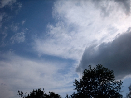 Das Bild zeigt links Cirruswolken und rechts eine aufziehende Stratocumuluswolke. Dies könnte auf einen Wetterwechsel hindeuten, da die Wolken sich scheinbar verdichten. Auch die hohe Bewölkung ist verdächtig.