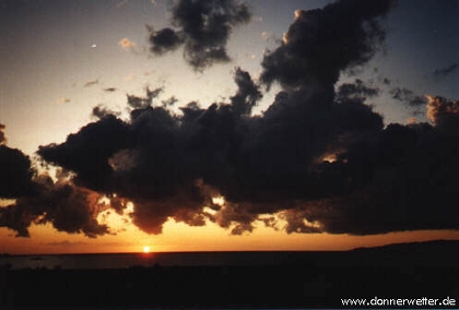Dieser schöne Sonnenuntergang zeigt uns eine freundliche Wetterlage mit Stratocumuluswolken auf der Insel Korsika. Im laufe des Tages entwickeln sich die Stratocumuluswolken zu Cumuluswoken. Normalerweise sollten sie sich innerhalb einiger Stunden auflösen und eine klare Nacht bescheren.