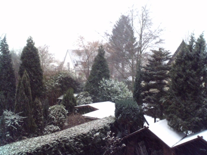 Graue Nimbostratuswolken mit Schnee liegen über der Region. Diese Wolken treten in Tiefdruckgebieten auf. Eine Wetterfront zieht über die Region. Was im späteren Wetterverlauf noch passieren wird kann man nicht vorhersagen, da die obere Atmosphäre nicht zu sehen ist. Wir sehen nur Schnee, also kann unsere Vorhersage für die nächsten Stunden nur heißen: es schneit die nächsten Stunden und wenn es aufhört, hört es auf.