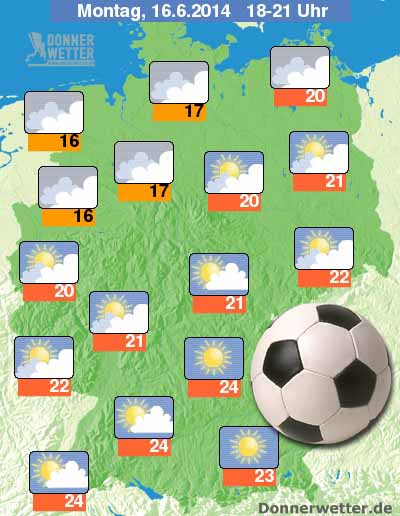 Am Montag 18 Uhr unserer Zeit tritt die deutsche Nationalmannschaft zum ersten Mal bei der Fußball-WM in Brasilien an. Und dem Mitfiebern und Mitfeiern steht wenig im Wege: Tagsüber kann es in der Nordhälfte zwar einzelne Schauer geben, zum Abend ist das Schauerrisiko aber meist gering.