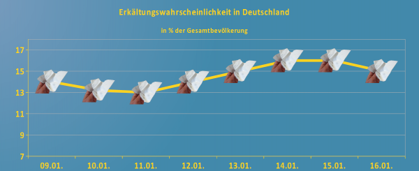Sind zu Wochenbeginn etwa 14% der Bürger von Husten und Schnupfen geplagt, werden im weiteren Wochenverlauf Spitzenwerte um 16% erreicht.