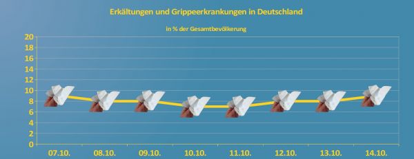 Die anfänglich noch erhöhte Anzahl an Erkältungs- und Grippenerkrankungen schwächt sich im Laufe der Woche ab. Im Verlauf der neuen Woche ist dann wieder mit einem Schnupfnasen-Anstieg zu rechnen: Bis zu neun Prozent schlagen sich dann mit einem Herbstleiden herum.