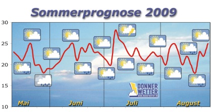 Dennoch können wir für die eigentlichen Sommermonate nicht das versprechen, was sich viele unter Sommerwetter vorstellen: Über Wochen anhaltender, ungetrübter Sonnenschein bei hohen Temperaturen ist unwahrscheinlich. Wir gehen von einem sehr wechselhaften Sommer 2009 aus.