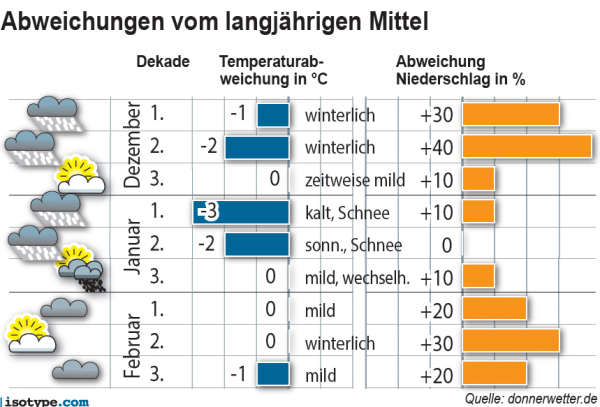 Die aktuellen Langfristmodelle berechnen derzeit die Wintermonate auch als solche: Vor allem Dezember und Januar bringen dann nicht nur kaltes sondern auch zum Teil schneereiches Wetter. Bis auf die zweite Januardekade liegen die prognostizierten Niederschlagsmengen allesamt über den langjährigen Mittelwerten.