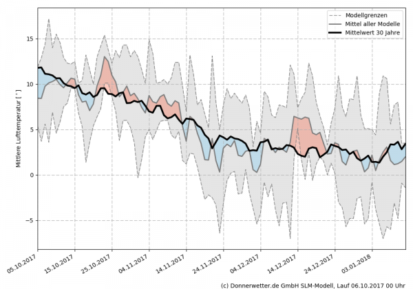 Von den Temperaturen und den zu erwartenden Niederschlagsmengen eher durchwachsene Herbstwochen liegen vor der Nordhälfte Deutschlands. Positiv hervor sticht die zur Zeit berechnete Sonnenscheindauer, inbesondere für den Zeitraum Mitte Oktober bis Anfang November.