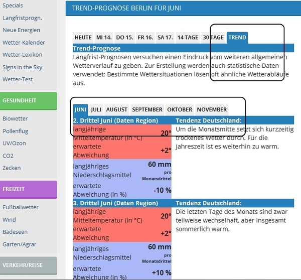 Die Trendvorhersagen sind ab sofort im Internet auf der Webseite www.donnerwetter.de zu finden. Nach der Eingabe des gesuchten Ortes in Deutschland können die Vorhersagen der kommenden 6 Monate als Ergänzung der Wettervorhersage der nächsten Tage ausgewählt werden.