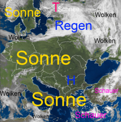 ![]() | | Satellitenbild 15.04.2020 Große Sonneninsel umgeben von Wolken |