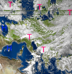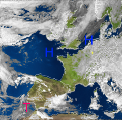 Hoch bei den Britischen-Inseln vertreibt die Schauerwolken