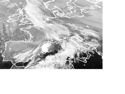 Ein dichtes Wolkenband erstreckt sich von Großbritannien und der Nordsee über Frankreich und Deutschland bis nach Italien. Es beinhaltet den Ausläufer eines Tiefs bei Island und bringt heute vor allen in Frankreich und im Südwesten Deutschlands teils kräftigen Regen. Westlich und östlich dieses Ausläufers sorgt Hochdruckeinfluss für meist freundliches Wetter. (Bildquelle: NERC Satellite Receiving Station, Dundee University, Scotland, http://www.sat.dundee.ac.uk/)