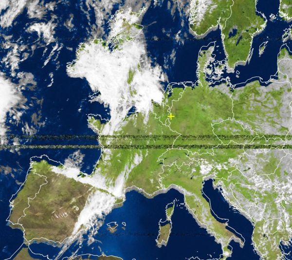 Auf dem Satellitenfoto von heute Nachmittag zeigt sich Europa verbreitet heiter oder sonnig und trocken. Ein Tief über dem Atlantik sorgt mit seinen Ausläufern jedoch für die Zufuhr feuchtwarmer Luftmassen in große Teile Frankreichs und vor allem auf die Britischen Inseln. Gebietsweise sehr starke Gewitter entwickeln sich dabei vom Norden Frankreichs bis hinüber nach Benelux.