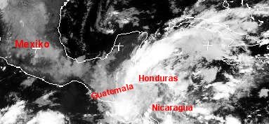 Auf dem Satellitenfoto ist ein dichtes und ausgeprägtes Wolkenpaket über den mittelamerikanischen Staaten Guatemala, Honduras und Nicaragua auszumachen. Hierbei handelt es sich um vielfach hochreichende Wolken, die für vielerorts extreme Niederschläge und zahlreiche Überschwemmungen verantwortlich sind.