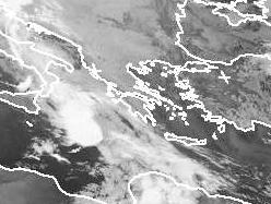Auf dem Satellitenbild von Freitag früh ist eine Schauer- und Gewitterzelle südlich Italien gut zu erkennen. Sie wird heute weiter nach Osten ziehen und vor allem in Griechenland für teils kräftige Schauer und Gewitter sorgen. Dabei sind auch starke bis stürmische Windböen möglich. (Bildquelle: NERC Satellite Receiving Station, Dundee University, Scotland, http://www.sat.dundee.ac.uk/)