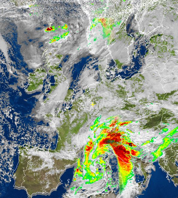 Auf dem Satellitenfoto von heute Nachmittag ist eindrucksvoll der Wirbel des kräftigen Tiefdrucksystems über dem zentralen Mittelmeer zu erkennen. Insbesondere weite Teile Italiens werden von ergiebigem, langanhaltenden und kräftigem Regen heimgesucht. Dazu bilden sich nicht selten sogar Gewitter.