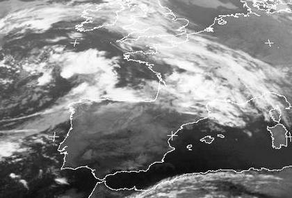 Der Ausschnitt zeigt das Tief bei den Azoren etwas genauer. Auffällig ist das freundliche Wetter in Spanien und die vielen Wolken, zum Teil mit Gewittern, in Südfrankreich. Dieser Effekt entsteht durch die südliche Anströmung der Pyrenäen: auf deren Nordseite trifft feuchte Mittelmeerluft auf die kühlere Atlanktikluft und es entwickeln sich verbreitet Schauer und Gewitter.