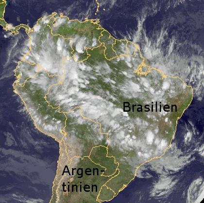 Zahlreiche Gewitter befinden sich heute über dem Südamerikanischen Kontinent. Eine besonders ausgeprägte Aneinanderreihung von Gewittern zeigt sich von Panama über Kolumbien bis nach Südbrasilien, sie erscheinen fast in Form einer Linie oder Front. Auch im Nordosten des Kontinents gibt es zahlreiche Gewitter, freundlicher mit viel Sonnenschein ist es dagegen an der Südspitze Brasiliens, in Paraguay, Uruguay und in Argentinien.