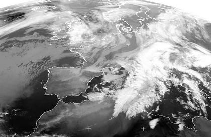 Das Satellitenbild zeigt ein ausgedehntes Hoch über dem Atlantik, auf dessen nordöstlicher Seite kühle Luft und Schauerwolken nach Mitteleuropa vorankommen. Vom weißen Meer über das Baltikum zieht sich ein Wolkenband bis hinunter nach Italien und Nordafrika. Es markiert die Vordergrenze eines älteren Kaltluftvorstoßes. Zum Teil fällt aus diesen Wolken ergiebiger Regen.