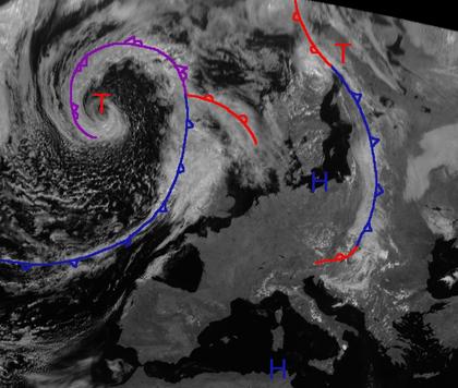 Hoch 'Mara' über der Ostsee bringt verbreitet sonniges Wetter von Südskandinavien bis zum nördlichen Afrika. Dagegen liegt vom nördlichen Skandinavien bis zu den Alpen ein Tief mit Regen- und Gewitterwolken. Auch über den Britischen Inseln sorgt ein Tief für Regen, Gewitter und Wind. Die Kaltfront dieses Tiefs zieht morgen nach Mitteleuropa, in der Nacht zum Dienstag dann mit Schauern und Gewittern auch über Deutschland hinweg.