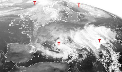Tiefdruckgebiete über dem nördlichen Atlantik, Finnland, sowie dem Tyrrhenischen Meer und dem Balkan sorgen für Wolken und vor allem im Mittelmeer kräftige Schauer und Gewitter. Von Irland über Frankreich und Deutschland bis ins Baltikum bringt leichter Hockdruckeinfluss meist freundliches Wetter mit nur wenigen Wolken.