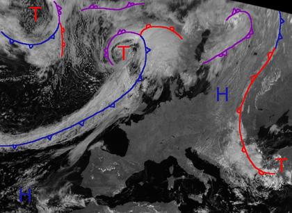 Eine Hochdruckbrücke erstreckt sich vom Hoch 'Ottilia' über dem Baltikum bis zu einem Hoch in Nähe der Azoren. In weiten Teilen dieses Bereiches ist es wolkenarm und trocken. Über Südosteuropa bringt dagegen ein Gewittertief viele Wolken. Auch über Nordwest- und Nordeuropa tummeln sich einige Tiefdruckgebiete mit dichter Bewölkung. Die Kaltfront des Tiefs 'Jochen' bei Schottland zieht dabei bis morgen Abend nach Mitteleuropa und auch Deutschland hinein.