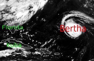 Hurrican 'Bertha' hat sich im Laufe des gestrigen Tages wiederum verstärkt und zieht mit durchschnittlichen Windgeschwindigkeiten um 170 km/h noch einige Stunden Richtung Nordwesten, bevor er voraussichtlich am Abend immer weiter auf nördliche Richtungen dreht und sich anschließend leicht abschwächt. Mit seinem Zentrum wird 'Bertha' am Samstag oder Sonntag nur wenige km östlich der Bermuda-Inseln vorbeiziehen, so dass es dort zu orkanartigen Böen mit ergiebigen Niederschlägen kommen dürfte. Die mittleren Windgeschwindigkeiten liegen dann immer noch bei voraussichtlich 160 km/h, in Böen teils bei 190 km/h. Eine deutliche Abschwächung des Hurricans ist er für Dienstag zu erwarten, erst dann wird sich 'Bertha' zu einem Sturmtief abgeschwächt haben.