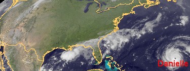 Im westlichen Atlantik befindet sich zur Zeit der Hurrikan 'Danielle'. Er hat heute mit durchschnittlichen Windgeschwindigkeiten um 210 km/h voraussichtlich sein Stärkemaximum erreicht und zieht im weiteren Verlauf weiter nach Norden.
