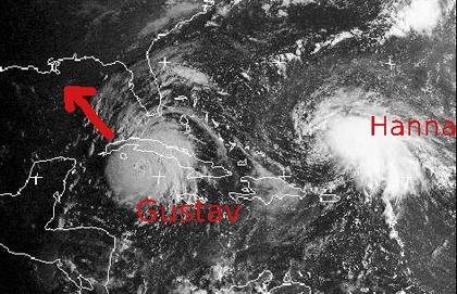Der Hurrikan 'Gustav' erreichte am Samstag mittlere Windgeschwindigkeiten bis 200 und in Böen bis zu 250 km/h. Dabei zieht er über Westen Kubas hinweg. Der Hurrikan zieht dann weiter über den Golf von Mexiko an die Südküste der USA, etwa in den Bereich des Mississippideltas, wo er schon am Montag früh eintreffen wird. Dabei besteht erhebliche Gefahr für die Region um New Orleans, da er sich nach den letzten Berechnungen zuvor sogar noch etwas verstärken kann.