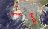 Auf dem Satellitenfoto zeigt sich Hurrikan 'Jimena' genau über der mexikanischen Halbinsel Niederkalifornien. Zur Zeit erreicht er noch mittlere Windgeschwindigkeiten um 170 km/h, in Böen sind bis 210 km/h möglich. Er bringt vor allem auf der mexikanischen Halbinsel, teils aber auch im Bereich der mexikanischen Westküste zum Teil erhebliche Regenmengen mit sich. Im Laufe des Donnerstags wird er aber voraussichtlich zu einem tropischen Sturm und später zu einem tropischen Tief abgestuft.