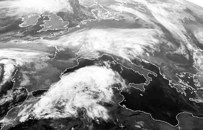Dichte Wolken breiten sich von Frankreich über Süddeutschland bis nach Ungarn aus. Sie gehören zu einem kleinen Tief, das heute von West nach Ost über die Alpen hinwegzieht, und dabei für teils kräftige Regen- und Schneefälle sorgt. Auch über dem westlichen Mittelmeer und der Iberischen Halbinsel bringen Wolken heute Schauer, zum Teil auch Gewitter. Nur über dem östlichen Mittelmeer, sowie in einem schmalen Streifen zwischen England und Norddeutschland, ist es heute unter Hochdruckeinfluss meist Wolkenarm und trocken.