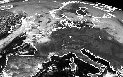 Das Hoch 'Rahel' sorgt für wolkenarmes Wetter von Deutschland nach Südosteuropa. Über der Nordsee und Nordfrankreich erkennt man auf dem Satellitenbild vom Montagmittag aber bereits dichtere Wolkenfelder. Sie ziehen in der Nacht vor allem in den Norden Deutschlands. (Bildquelle: NERC Satellite Receiving Station, Dundee University, Scotland, http://www.sat.dundee.ac.uk/)