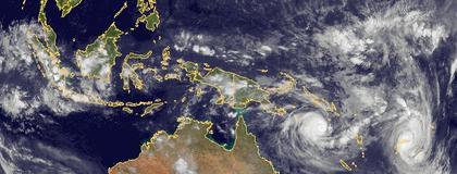 Über Indonesien und Neuguinea treten schwere Schauer und Gewitter auf, die sich im Bereich der innertropischen Konvergenzzone entwickeln. Östlich von Australien befinden sich zwei tropische Stürme, der westlichere heißt 'Ului', der östlichere 'Thomas'. Im Bereich von 'Ului' werden Windgeschwindigkeiten von 240 km/h erreicht, im Bereich von 'Thomas' werden Windgeschwindigkeiten von 200 km/h erreicht. Beide Stürme werden sich in den nächsten Tagen abschwächen.