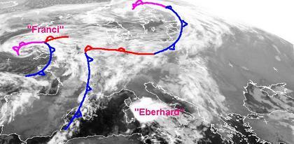 In weiten Teilen Mittel-, West- und Südeuropas überwiegt Tiefdruckeinfluss. Auf dem Satellitenbild vom Freitagmorgen sind zwei Tiefdruckgebiete zu erkennen; der eine von ihnen liegt über Nordskandinavien, Wolken seines Frontensystem reichen bis nach Deutschland; bei Irland baut sich das neue Tief 'Franci' auf, das in den nächsten Tagen immer wieder für Regen oder Schauer in West- und Mitteleuropa sorgt. Das alte Tief 'Eberhard' über Italien löst sich weiter auf, heute bringt es noch teils kräftige Schauer und Gewitter im ganzen Land. Das Hoch 'Querida' mit Zentrum über dem Schwarzen Meer sorgt für ruhiges, teils heiteres, teils trübes Wetter in Osteuropa sowie auf dem östlichen Balkan, gebietsweise kann man hochnebelartige Wolkenfelder erkennen.